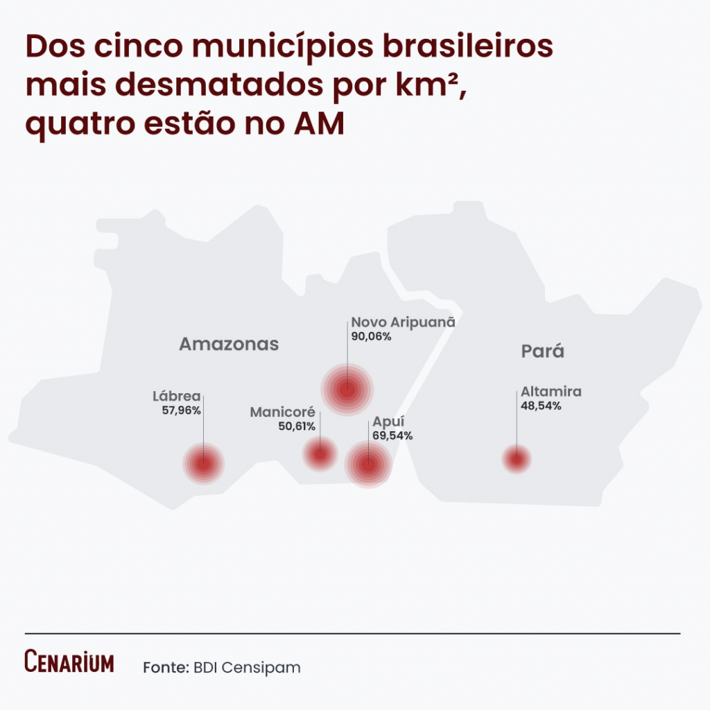 MANAUS (AM) – Dados do Boletim de Desmatamento e Ilícitos Ambientais (BDI Censipam) mostram que dos cinco municípios mais desmatados no Brasil por quilômetros quadrados, quatro estão no Estado do Amazonas. As cidades amazonenses que são impactadas com o desmatamento estão concentradas na região sul do Estado, conhecida como “arco do fogo”. São eles: Apuí, Lábrea, Manicoré e Novo Aripuanã.