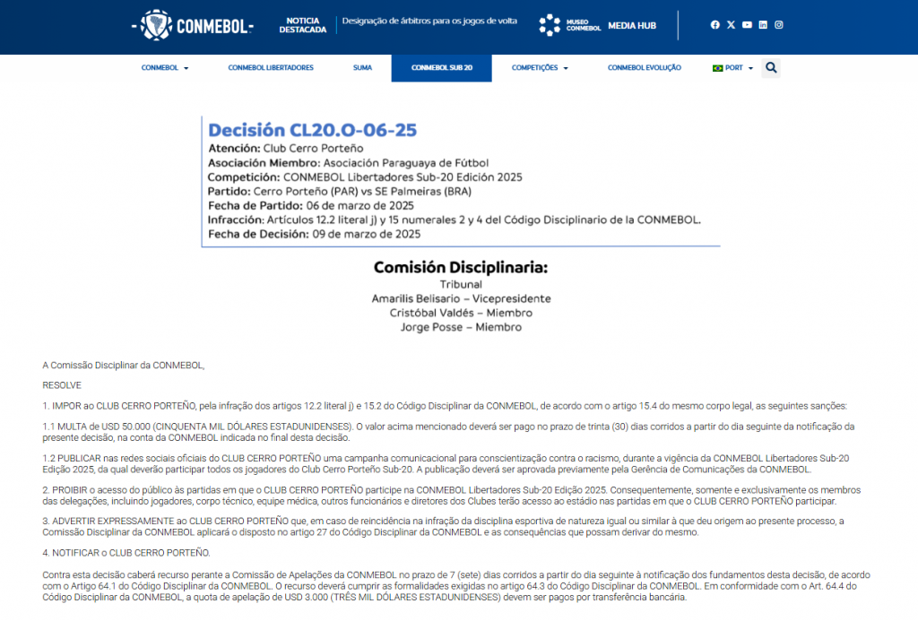 A Conmebol ainda exigiu que o clube terá que “publicar, nas redes sociais oficiais, uma campanha de comunicação de conscientização contra o racismo, durante a duração da Conmebol Libertadores Sub-20 Edição 2025“.