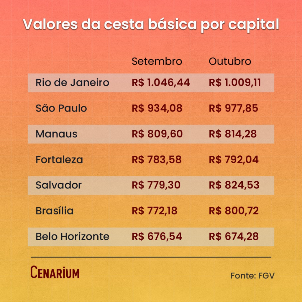 Os dados da FGV apontam que Salvador (BA) e São Paulo (SP) foram as capitais que mais apresentaram aumento nos valores das cestas alimentícias, com 5,8% e 4,7%, respectivamente. Já Curitiba (PR) e Rio de Janeiro (RJ), foram as cidades que mais apresentaram queda nos valores, com -3,8% e -3,6%. Mesmo com a diminuição no preço, a capital carioca continua liderando a lista de cidades com a cesta básica mais cara do Brasil. Os dados da FGV mostram que, no mês de setembro, o valor era de R$ 1.046,44. Em outubro, o valor passou a custar R$ 1.009,11.