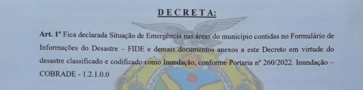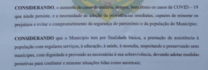 A prefeitura do município justifica ainda que a adoção de providências imediatas foi tomada devido ao aumento de casos de malária, dengue e Covid-19. A medida visa conter os prejuízos e evitar o comprometimento da segurança do patrimônio e da população.