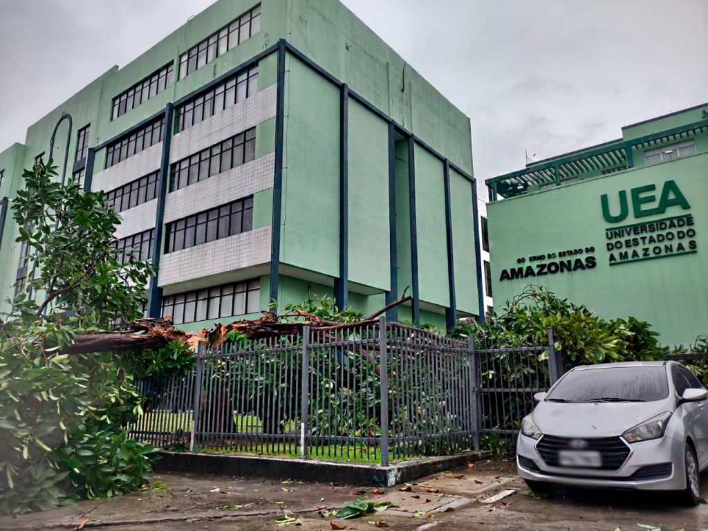 Uma árvore com mais de 10 metros de altura foi partida ao meio com a força dos ventos. O exemplar de jambeiro estava em uma área da unidade de saúde da Universidade do Estado do Amazonas (UEA), na zona Sul de Manaus. Não houve registro de feridos.