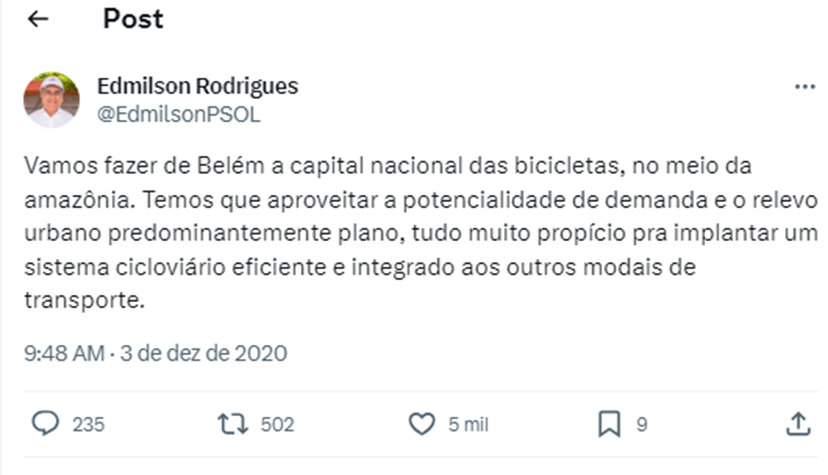 Após a campanha eleitoral de 2020, o atual prefeito Edmilson Rodrigues (PSOL) prometeu tornar Belém “a capital nacional das bicicletas na Amazônia”. Suas promessas incluíam a expansão e melhoria das ciclovias e ciclofaixas na cidade, aumento da fiscalização das vias e manutenção dos trechos já existentes. No entanto, faltando pouco mais de um ano para o fim do seu mandato, muitos ciclistas da cidade se sentem desapontados com o andamento das melhorias prometidas.