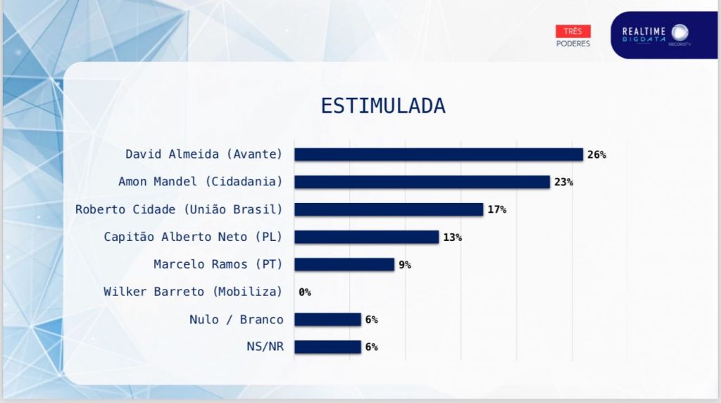 Nova pesquisa divulgada pelo instituto Real Time Big Data, nessa sexta-feira, 2, aponta um novo cenário para o segundo turno na disputa pela Prefeitura de Manaus. De acordo com o levantamento, o pré-candidato Roberto Cidade (17%) aparece tecnicamente empatado com o candidato do Cidadania, Amom Mandel (23%), no limite da margem de erro, que é de três pontos percentuais para mais e para menos.