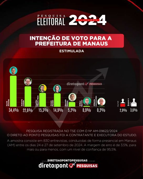 Realizada entre os dias 24 e 27 de setembro, a pesquisa entrevistou presencialmente 830 eleitores de Manaus, cobrindo as seis zonas eleitorais da capital. Com uma margem de erro de 3,5 pontos percentuais e um grau de confiança de 95,5%, o levantamento foi registrado no Tribunal Superior Eleitoral (TSE) sob o número AM-09622/2024.
