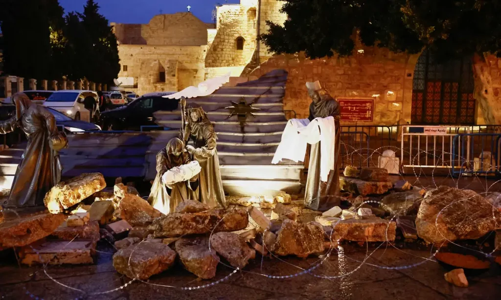No lugar do habitual presépio, as igrejas de Belém, neste ano, colocaram as representações em meio a escombros e arame farpado, em solidariedade às pessoas da Faixa de Gaza.