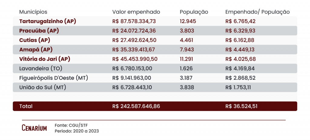 Dos dez municípios auditados, somente os cinco do Amapá receberam, de 2020 a 2023, quase R$ 300 milhões de um montante de pouco mais de R$ 330 milhões. Ou seja, 68,64% do valor total, com destaque para Tartarugalzinho, que tem uma população de quase 13 mil habitantes e garantiu R$ 87,5 milhões da verba. Segundo informações do portal Metrópoles, a cidade é governada pelo prefeito reeleito Bruno Mineiro (União), aliado do senador David Alcolumbre, do mesmo partido.