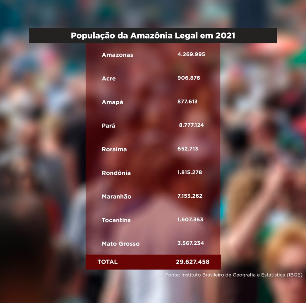 A Amazônia Legal inclui, atualmente, os Estados do Amazonas, Acre, Pará, Amapá, Roraima, Rondônia, Tocantins e parte do Mato Grosso e Maranhão. A população da região, em 2021, é estimada em pouco mais de 29 milhões de pessoas, segundo o Instituto Brasileiro de Geografia e Estatística (IBGE).