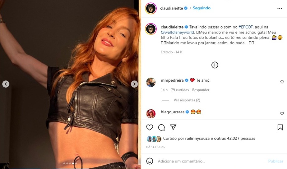 “Tava indo passar o som no #Epcot, aqui na @waltdisneyworld. Meu marido me viu e me achou gata! Meu filho Rafa tirou fotos do lookinho. eu tô me sentindo plena! Marido me levou para jantar, assim, do nada”, escreveu.