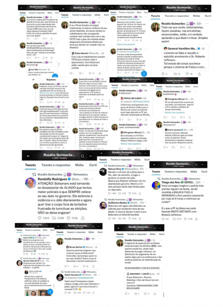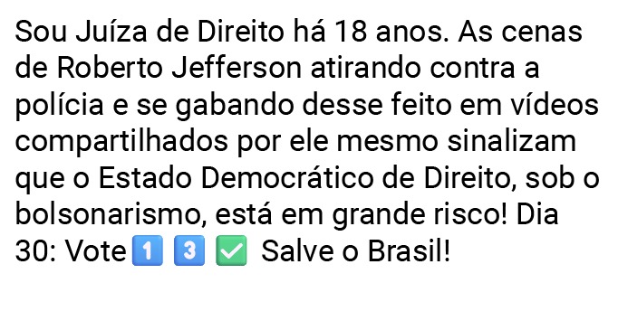 Em um dos prints, Rosália incentiva os seguidores a votar em Lula, à época candidato à Presidência. “Sou juíza de Direito há 18 anos. As cenas de Roberto Jefferson atirando contra a polícia e se gabando desse feito em vídeos compartilhados por ele mesmo sinalizam que o Estado Democrático de Direito, sob o bolsonarismo, está em grande risco! Dia 30: vote 13. Salve o Brasil!“, escreveu Rosália no X.