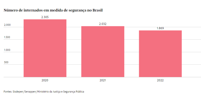 Dados da Secretaria Nacional de Políticas Penais de dezembro de 2022 apontam que, das 832.295 pessoas presas no Brasil, 1.869 são internos em medida de segurança em hospitais de custódia, que têm capacidade para 4.006 pessoas, distribuída em 27 hospitais de custódia e tratamento psiquiátrico.