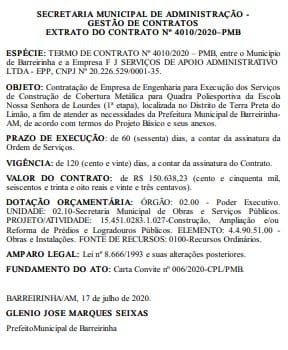 MANAUS – Em meio à crise econômica causada pela pandemia da Covid-19, a cobertura metálica da quadra poliesportiva da Escola Nossa Senhora de Lourdes, em Barreirinha (a 326 quilômetros de Manaus), custará R$ 150 mil aos cofres públicos municipal. O prefeito da cidade, Glênio Seixas (PMDB), contratou uma empresa para realização da obra. O extrato do contrato foi publicado nesta quarta-feira, 29, no Diário Oficial dos Municípios (DOM).