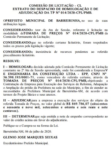Somente a reforma, adequação e ampliação do prédio da prefeitura custará R$ 869 mil. A empresa contrata é a V e Engenharia da Construção Ltda. Para a prestação de serviços de transporte fluvial de passageiros e cargas, a prefeitura contratou as empresas E. Queiroz Costa – ME; Petrônio Alves de Almeida – ME; K K V de Sá Souza & CIA Ltda – ME; e A. I. R de Araújo, respectivamente, por R$ 580 mil, R$ 652 mil, R$ 664 mil e R$ 290 mil, todas para um período de 12 meses.