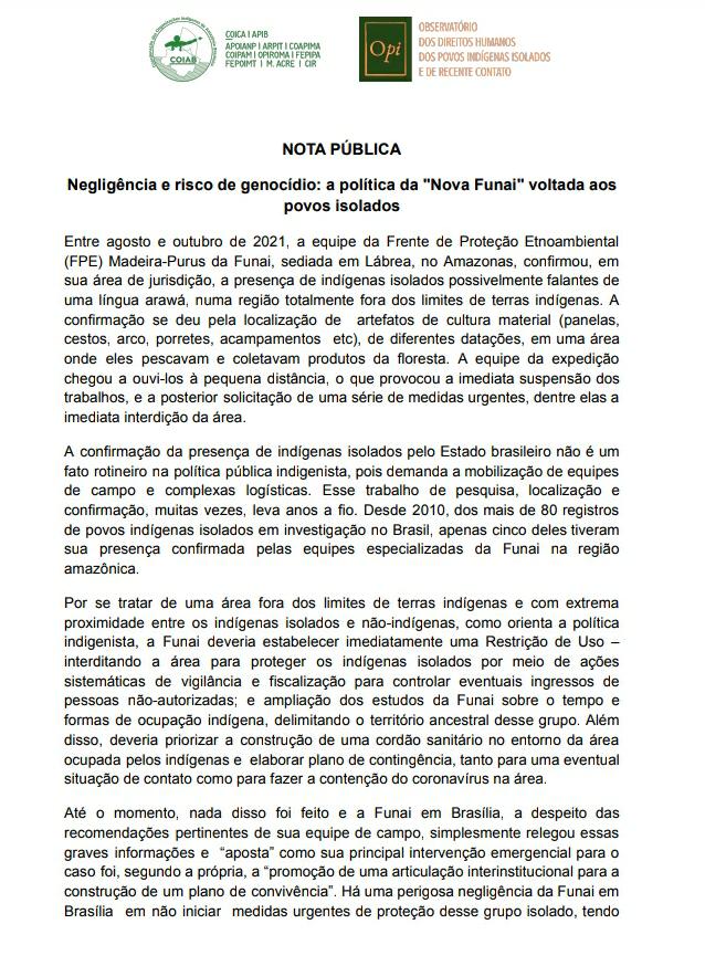 Dentre as observações contidas na nota, a Coiab estabelece uma imediata restrição de uso e interdição da área, para proteção aos indígenas, para evitar situação de contato e contenção do coronavírus na área. “O documento propõe, ainda, uma elaboração urgente, pela Funai, Sesai e representantes indígenas e de suas organizações, de um plano de contingência e a “investigação dos atos de prevaricação cometidos pelos servidores públicos da Funai, em Brasília-DF, que ao saberem da existência dos índios isolados, não atuaram, urgentemente, dentro de suas responsabilidades”.
