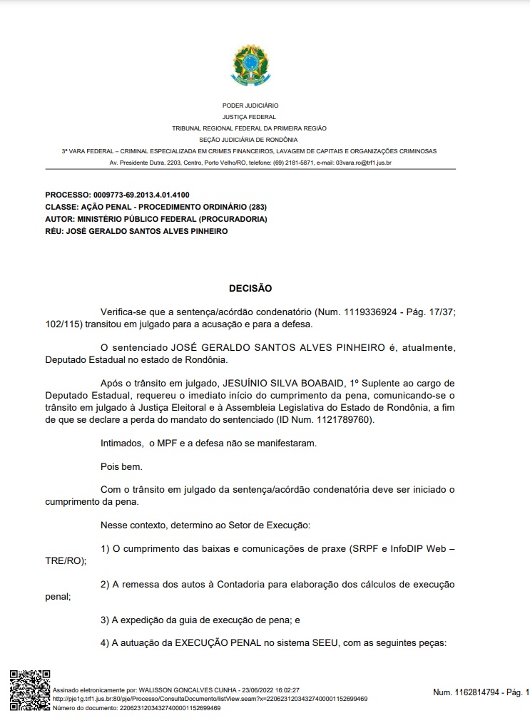VILHENA (RO) – A Terceira Vara da Justiça Federal da 1ª Região condenou o deputado estadual de Rondônia José Geraldo Santos Alves Pinheiro, do Partido Social Cristão (PSC), por crime contra a ordem tributária, e determinou que a Assembleia Legislativa (Ale-RO) declare a perda do mandato do parlamentar, mais conhecido pelo nome político – e por sua coleção de polêmicas: Geraldo da Rondônia.