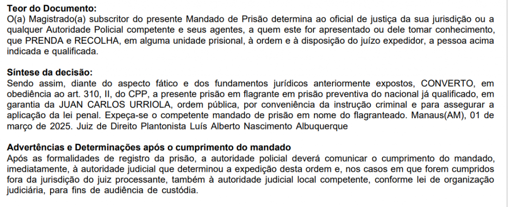 Atualmente, o colombiano tem dois mandados de prisão em aberto, de acordo com apuração feita pela CENARIUM. Após a liberação na audiência de custódia, o suspeito, de 48 anos, está foragido. No último sábado, 1°, o juiz Luis Alberto Nascimento Albuquerque, da Central de Plantão Criminal do Tribunal de Justiça do Amazonas (TJAM), decretou a prisão preventiva de Juan Urriola “para assegurar a aplicação da lei penal”.