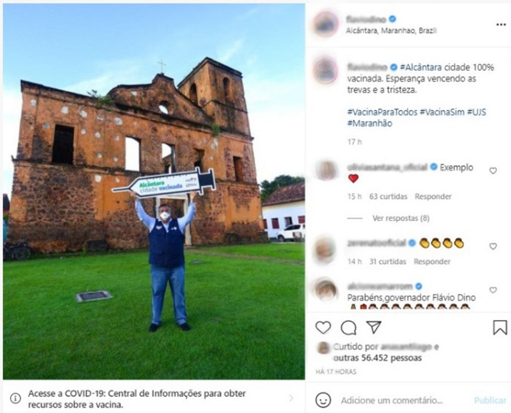 Ainda nessa quarta-feira, pelas redes sociais, o governador anunciou que o município de Alcântara, na Região Metropolitana de São Luís, chegou a 100% da população acima de 18 anos vacinada.