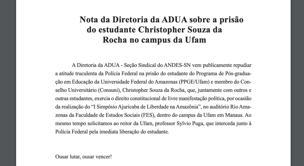 A diretoria da Associação dos Docentes da Universidade Federal do Amazonas (Adua) publicou nota sobre a prisão de Christopher Souza da Rocha. A Adua informou que Christopher e outros estudantes “exerciam o direito constitucional de livre manifestação política, por ocasião da realização do 1° Simpósio Ajuricaba de Liberdade na Amazônia”.