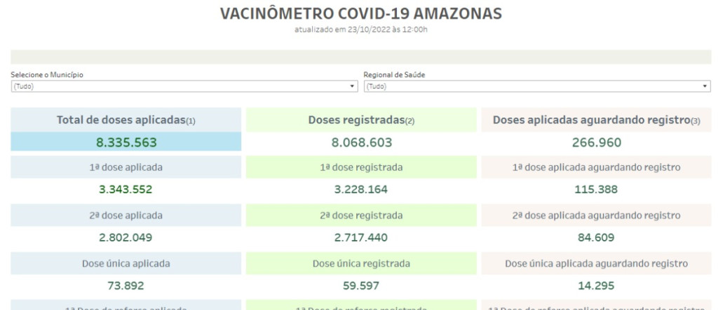 O vacinômetro da Fundação de Vigilância em Saúde informa que até neste domingo, 23, foram 8.335.353 doses aplicadas em todo o Estado. Em relação à primeira dose, 3.343.552 registros, para a segunda aplicação da vacina foram 2.802.049 doses e 73.892 registros para as doses únicas.