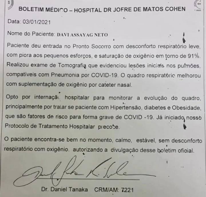No boletim, assinado pelo médico Daniel Tanaka, o hospital informa que David Assayag deu entrada no Pronto-Socorro com desconforto respiratório leve, com piora aos pequenos esforços e saturação de oxigênio em torno de 91%. Na unidade, ainda segundo o boletim, o cantor realizou tomografia, que evidenciou lesões iniciais no pulmão, compatível com pneumonia por Covid-19.