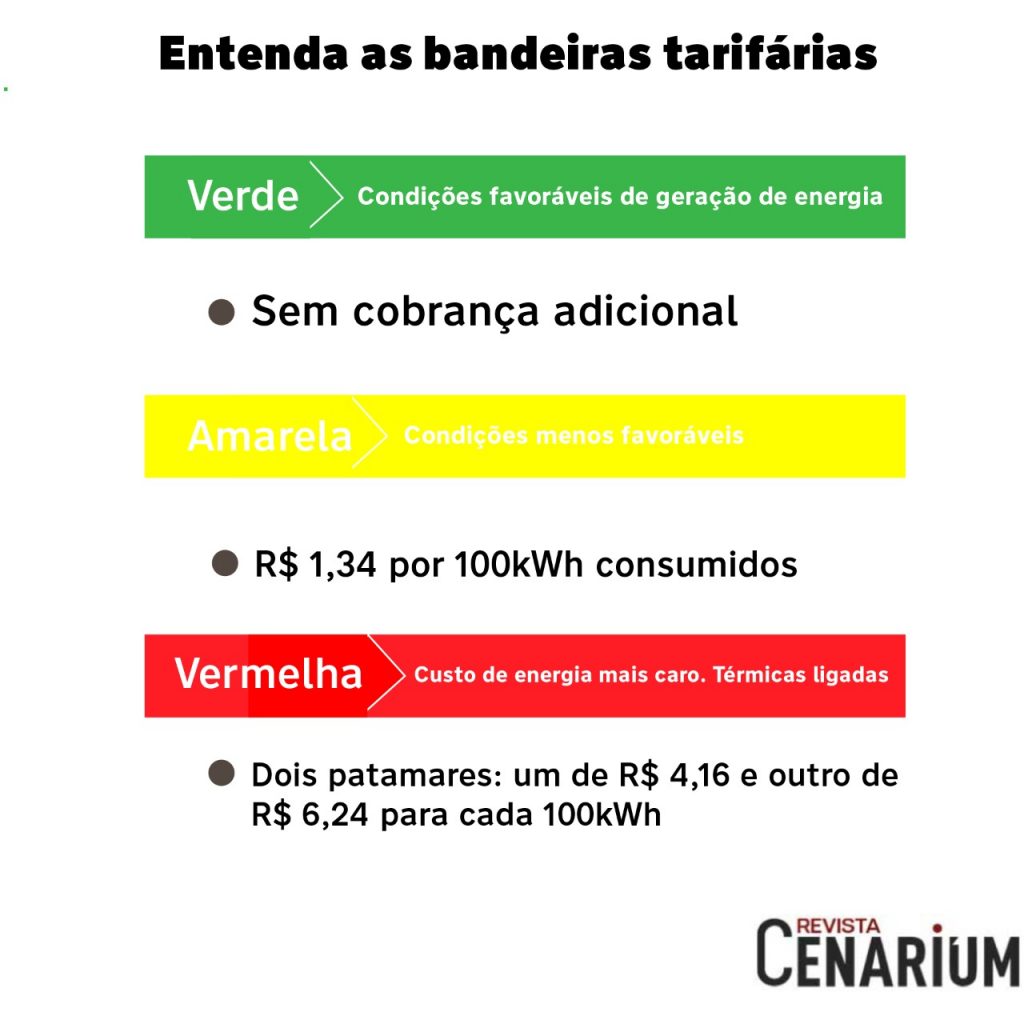 Atualmente, as bandeiras tarifárias são divididas em três fases: verde, quando há condições favoráveis para a geração de energia e não há necessidade de cobrança adicional; amarela, quando as condições tornam-se menos favoráveis e a tarifa passa a sofrer um acréscimo a cada quilowatt-hora (kWh) consumido; e vermelha, quando a produção de energia é mais custosa e a tarifa sofre um acréscimo maior.