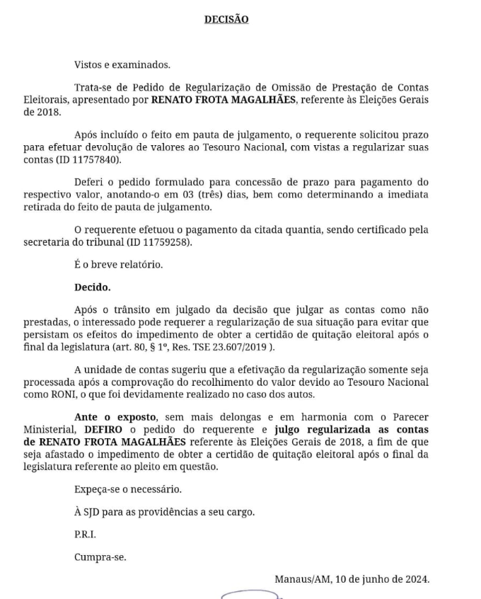 Dias depois, Renato Júnior pagou a quantia devida ao Tesouro Nacional e obteve a certidão de quitação eleitoral. O TRE-AM julgou regularizadas as contas do ex-secretário referentes ao pleito de 2018.