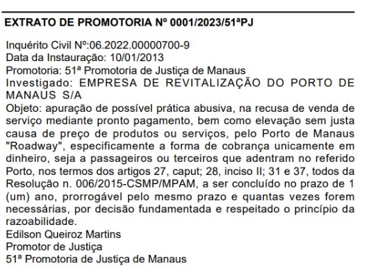 Conforme a ação, a empresa estaria cometendo práticas abusivas ao recusar “a venda de serviço mediante pronto pagamento, bem como elevação sem justa causa de preço de produtos ou serviços, pelo Porto de Manaus ‘Roadway’, especificamente a forma de cobrança unicamente em dinheiro, seja a passageiros ou terceiros que adentram no referido“, diz.