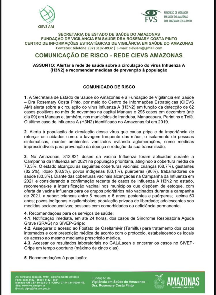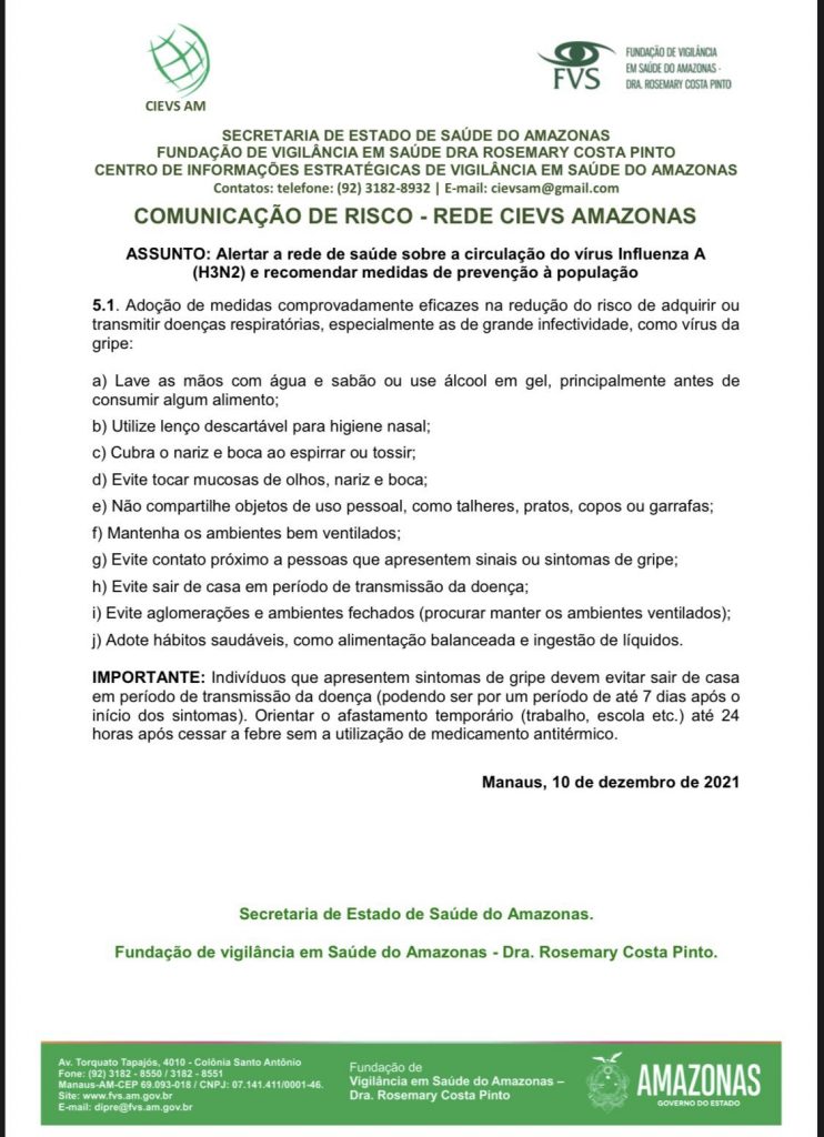 “Alerta à população da circulação desse vírus que causa gripe e da impotência de reforçar os cuidados, como a lavagem frequente das mãos, o isolamento de pessoas sintomáticas, manter ambientes ventilados, evitando aglomerações, como medidas imprescindíveis para a prevenção da doença e a redução da sua transmissão”, disse a fundação no comunicado de risco.
