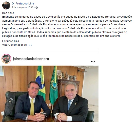 “Enquanto os números de casos de Covid estão em queda no Brasil e no Estado de Roraima, a vacinação aumentando a sua abrangência, o Ministério da Saúde já está discutindo a retirada de medidas restritivas, vem o governador do Estado de Roraima enviar uma mensagem governamental para a Assembleia Legislativa para pedir autorização a fim de colocar o Estado de Roraima em situação de “calamidade pública” por conta da Covid. Todos sabemos que o Estado de calamidade pública afrouxa as regras de licitação e de fiscalização que já são tão frágeis no nosso Estado. Isso tudo em um ano eleitoral”, criticou o vice-governador, em uma publicação no Facebook.