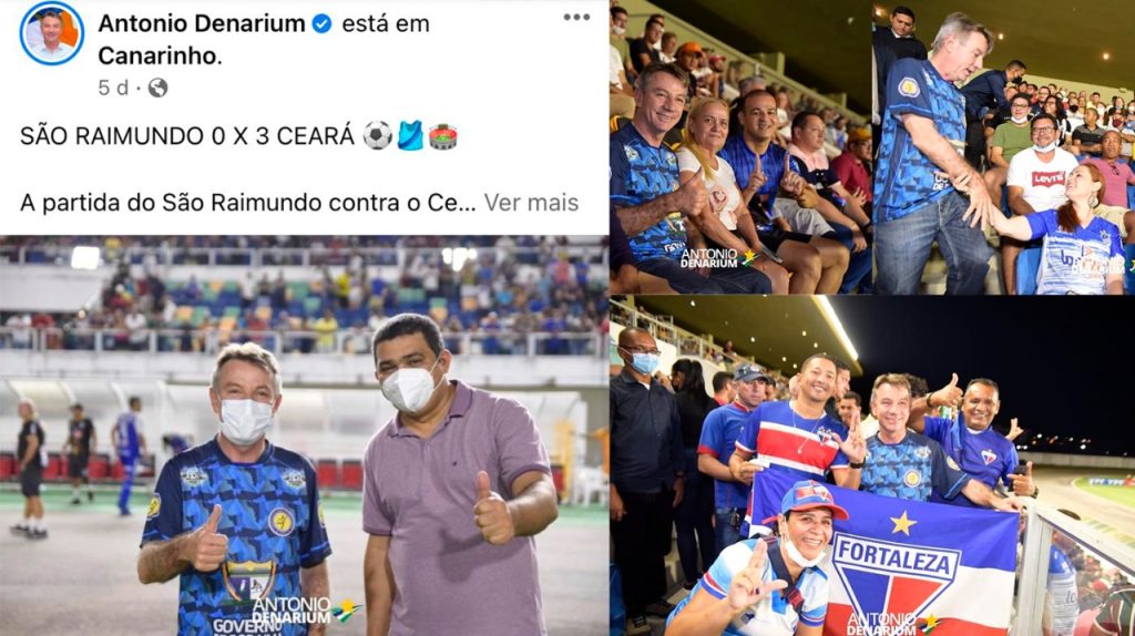 Na última quarta-feira, 2, como exemplo, o chefe do Executivo Estadual foi ao estádio Canarinho, em Boa Vista, acompanhar a partida de futebol entre os times São Raimundo e Ceará, pela Copa do Brasil. Ao lado dos torcedores na arquibancada, Denarium também surge sem o item de proteção. O duelo entre os clubes terminou com o clube de Fortaleza vencendo por 3 a 0, eliminando o adversário do campeonato.