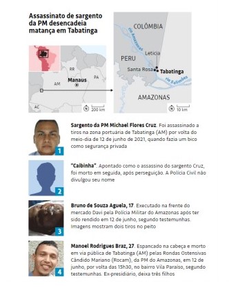 A onda de mortes ocorreu nos dias 12 e 13 de junho, mas só foi revelada duas semanas depois, após reportagem da Folha. O sargento Michael Cruz foi assassinado a tiros por volta do meio-dia, na região portuária de Tabatinga. O suposto autor do disparo foi morto na sequência.