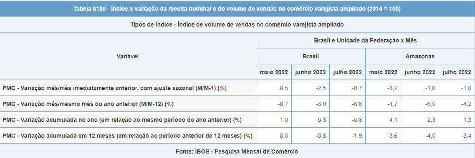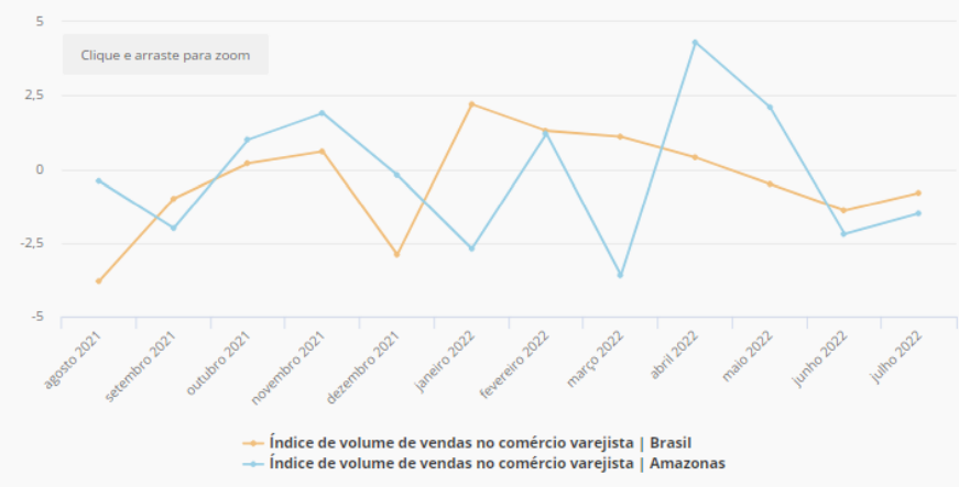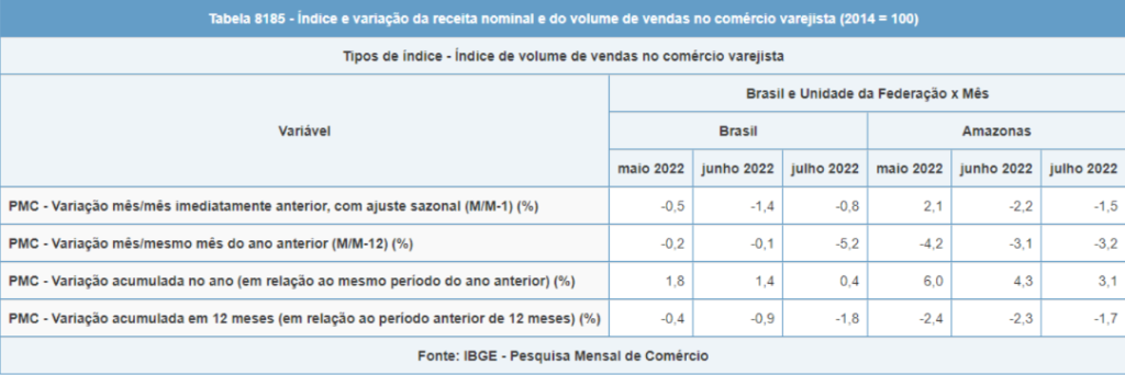 Por outro lado, a boa notícia é que apesar dos índices negativos entre o período de janeiro a julho deste ano, o volume de vendas do comércio acumulou 3,1% de alta em relação ao mesmo período do ano passado. Vale relembrar que naquela época, o comércio do Amazonas sofria as restrições causadas pela pandemia de Covid-19.