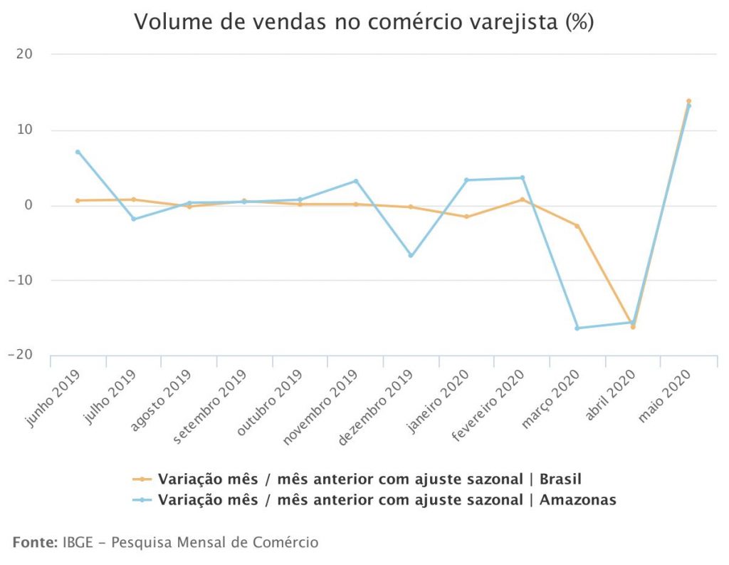 Em todo o Brasil, o volume de vendas do varejo cresceu 13,9%. Este é o maior crescimento desde o início da série histórica, em janeiro de 2020. O instituto diz, no entanto, que a alta foi insuficiente para o setor recuperar as perdas de março e abril, que refletiram os efeitos do isolamento social para o controle da pandemia do novo Coronavírus, vírus que já infectou 80 mil pessoas no Amazonas e 1,7 milhão em todo o País.