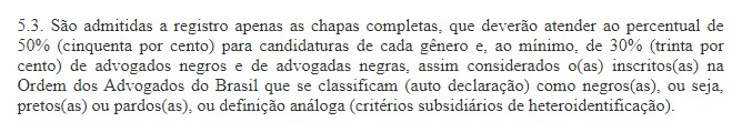 De acordo com o edital, “apenas chapas completas” tem os registros admitidos, mas o ofício deixa de mencionar candidaturas reservadas para indígenas. O item cinco do documento descreve que as candidaturas devem atender aos percentuais de gênero e raça. Veja trecho do documento: