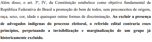 O pedido de impugnação foi feito à OAB/AM e a OAB nacional no qual destaca que o Amazonas é o Estado com a maior população indígena do País. O documento menciona que a exclusão de advogados indígenas do processo eleitoral contraria contraria princípios “constitucionais da igualdade e