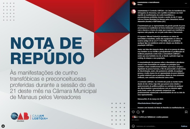 “A Comissão LGBTQIA+, da CAAAM, não pode se manter inerte diante de tais crimes, haja vista que possui como missão o aprimoramento de políticas públicas no combate de qualquer ato discriminatório e preconceituoso com as minorias sejam quais forem, assim, não podendo compactuar com posicionamento equivocado e discriminatório de um ou dois de seus representantes“, afirmou