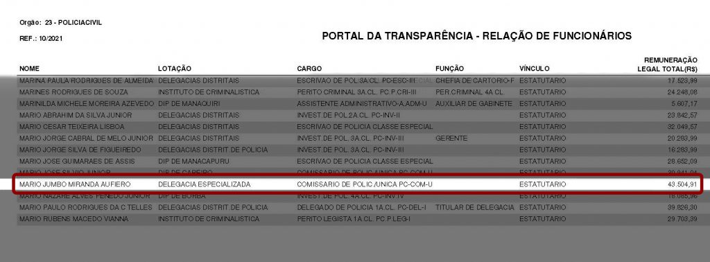 Conforme a reportagem investigativa da CENARIUM, Mário Jumbo Aufiero foi obrigado a voltar às atividades normais, na Polícia Civil do Amazonas (PC-AM), depois de 15 anos exercendo a presidência da Associação dos Delegados de Polícia do Estado do Amazonas (Adepol-AM). Nesse período, ele recebeu até R$ 43 mil de salário, mensalmente, pela Delegacia-Geral.