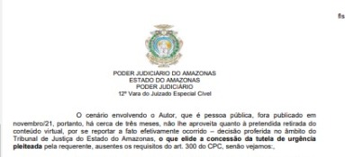O magistrado compreendeu que “o cenário envolvendo o autor, que é pessoa pública, fora publicado em novembro de 2021, portanto, há cerca de três meses [anteriores à ação de tutela] e logo “elide à concessão da tutela de urgência pleiteada pela requerente”.