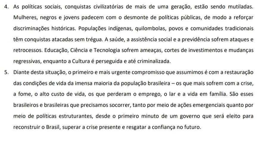 No tópico 38 do documento, que ressalta a união dos partidos para além da vitória eleitoral, é abordado ainda a implementação de um amplo conjunto de políticas públicas de promoção da igualdade racial e de combate ao racismo estrutural.