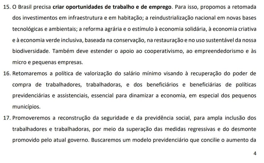 A proposta sugere a construção de uma nova legislação trabalhista visando a “valorização do salário mínimo e a recuperação do poder de compra”. O esboço informa, ainda, a intenção da reconstrução da seguridade e da previdência social.