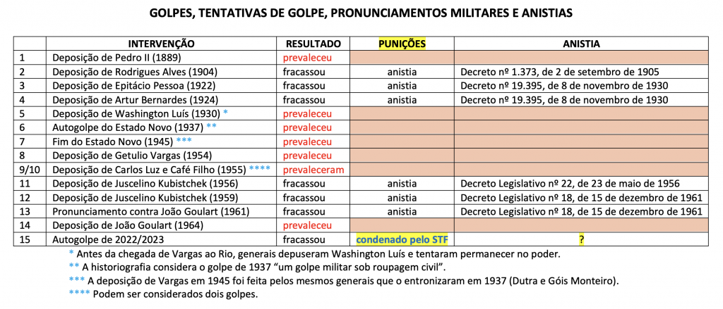 O ponto aberto entre civis e militares no Brasil, citado por Ebling, foi demonstrado pelo historiador Carlos Fico, em uma tabela publicada nas redes sociais. Especialista em História do Brasil República e Teoria da história, Fico aponta que foram registrados 15 eventos de golpes, tentativas de golpe e pronunciamentos militares, desde 1889, quando houve a deposição do imperador Dom Pedro II. Destes, oito prevaleceram e, dos sete que fracassaram, em seis deles os envolvidos foram todos anistiados, o que ressalta ainda mais a relevância desse julgamento pelo STF, pela punição inédita de militares.