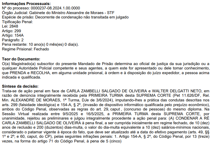 MANAUS (AM) – A deputada federal licenciada Carla Zambelli (PL-SP) foi presa nesta terça-feira, 29, em Roma, na Itália. A informação é do Ministério da Justiça e Segurança Pública do Brasil (MJSP). A parlamentar do partido do ex-presidente Jair Bolsonaro (2019-2022) foi condenada pelo Supremo Tribunal Federal (STF) a dez anos de prisão em regime fechado pelos crimes de falsidade ideológica e invasão do sistema de informática do Conselho Nacional de Justiça (CNJ). Veja mandado de prisão: