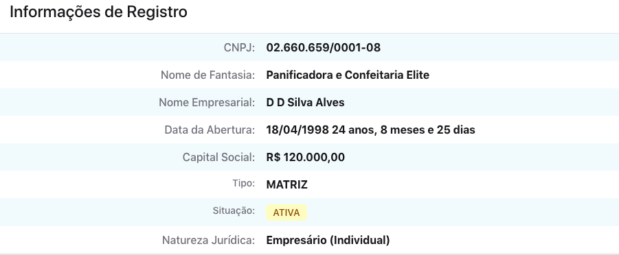 A panificadora Elite está inscrita no CNPJ 02.660.659/0001-08, como empresa individual, em nome de D. D. Silva Alves, com o capital social de R$ 120 mil, fundada há mais de 24 anos.