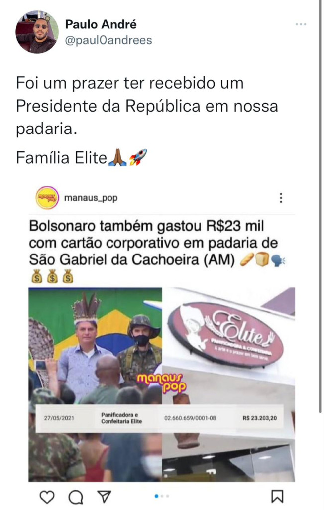 “Foi um prazer ter recebido um presidente da República em nossa padaria. Família Elite”, afirmou Paulo André, compartilhando o print da notícia intitulada: “Bolsonaro também gastou R$ 23 mil em uma padaria de São Gabriel da Cachoeira (AM)”