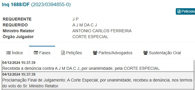 A denúncia contra Moutinho Jr. foi apresentada pelo Ministério Público Federal (MPF) depois que a investigação concluiu que há indícios dos crimes investigados no âmbito do inquérito conduzido pela PF. O processo foi aceito pela Corte Especial do STJ por unanimidade após o voto do relator do caso, ministro Antonio Carlos Ferreira. Com o recebimento da denúncia, uma ação penal é iniciada na Corte Superior e Moutinho Jr. será citado para apresentar a defesa.