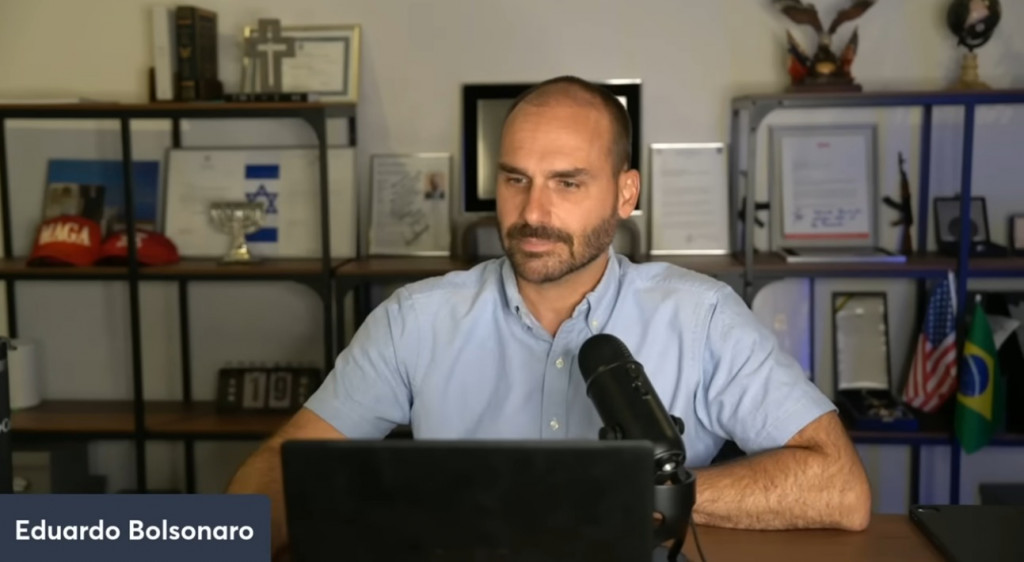No início do mês, o presidente Luiz Inácio Lula da Silva (PT) disse que Eduardo Bolsonaro pediu licença não remunerada do mandato na Câmara dos Deputados para ficar “tentando lamber as botas do [presidente dos Estados Unidos Donald] Trump”. A declaração foi registrada durante uma coletiva de imprensa em Brasília. Segundo Lula, as ações do deputado são inaceitáveis e podem ser caracterizadas como “terroristas”.