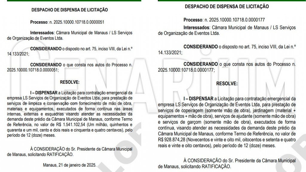 Três dias depois, no dia 24 do mesmo mês, o segundo contrato, com a mesma empresa – LS Serviços de Organização de Eventos Ltda – foi publicado no DOLM no valor de R$ 928.874,28 para a prestação de serviços de copeiragem, jardinagem, serviços de ajudante e serviços de garçom. O contrato também tem duração de 12 meses e com contratação de forma emergencial.