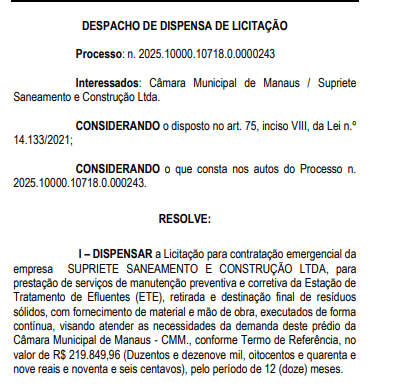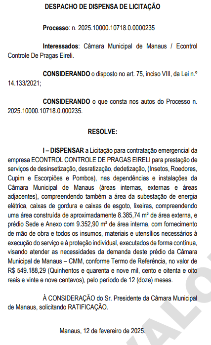 Na última semana, o presidente da CMM publicou no Diário Oficial do Legislativo Municipal (DOLM) a contratação de cinco novas empresas, sem licitação e de caráter emergencial, com vigência de 12 meses, para serviços de dedetização, manutenção e tratamento de fluentes. Anteriormente, David Reis já havia publicado no DOLM a contratação de uma empresa, em dois contratos diferentes, também sem licitação e de caráter emergencial para a prestação de serviço de limpeza e copeiragem da Casa Legislativa.