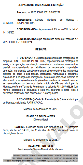 MANAUS (AM) – Em 40 dias eleito para presidir o biênio 2025-2026, da 19° Legislatura Municipal da Câmara Municipal de Manaus (CMM), o vereador David Reis (Avante) fechou cinco contratos sem licitações e em caráter emergencial. Juntos, eles somam o montante de R$ 4.996.060,23 milhões aos cofres público municipal.