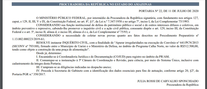 MANAUS – O Ministério Público Federal do Amazonas (MPF-AM) abriu um inquérito civil para investigar irregularidades na execução de um convênio entre o município de Uarini e o Ministério da Defesa, no valor de R$ 512.500,00. O recurso seria destinado para a construção de uma praça de alimentação na cidade.