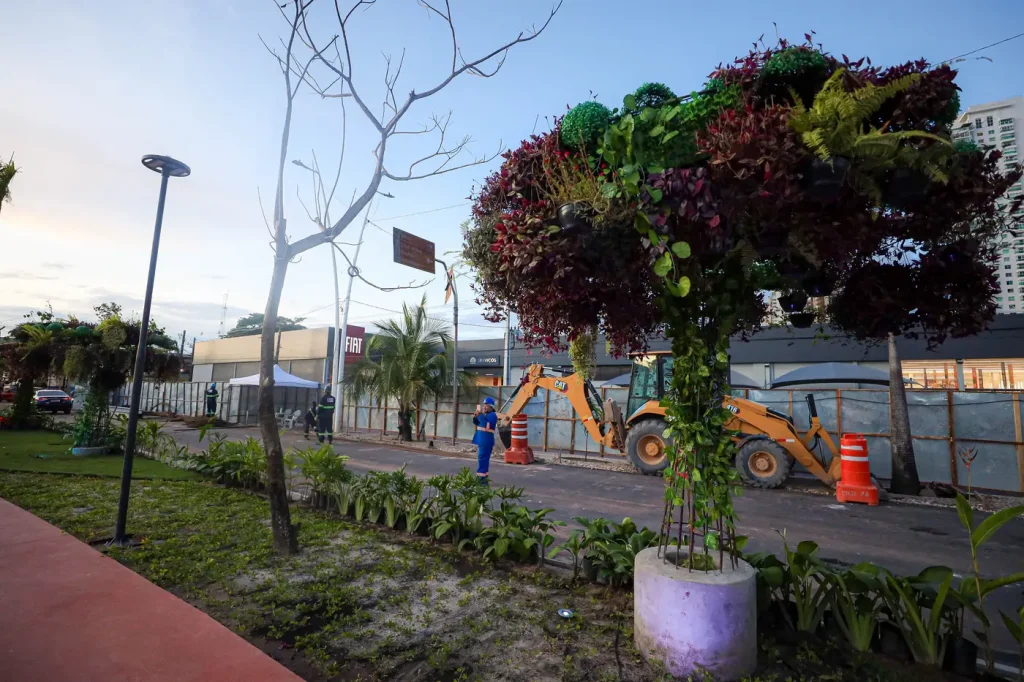A pasta destacou que a escolha das árvores artificiais foi inspirada em estruturas semelhantes encontradas em Cingapura, conhecidas por promover sombra e conforto térmico em áreas urbanas densas. “O objetivo foi reduzir as ilhas de calor em Belém. O perfil viário da Doca não dispõe de espaço para plantio de árvores de médio e grande porte”, informou a Seop.